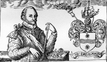 Sir Francis Drake with his new heraldic achievement, with motto: Sic Parvis Magna, translated literally: "Thus great things from small things (come)". The hand out of the clouds is labelled Auxilio Divino, or "With Divine Help"