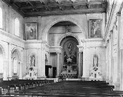 The interior of the church continued the Palladian theme. The large nave was colonnaded, with the columns supporting a clerestory of arch-topped windows, while the chancel was approached through an enormous arch that mirrored the classic Palladian Serlian arch, providing theatre and drama at the high altar. The flat compartmentalised ceiling is a more restrained version of that of the church of Santa Maria dei Miracoli in Venice. Unfortunately, the church's twin bell towers had to be removed following an earthquake in 1942.