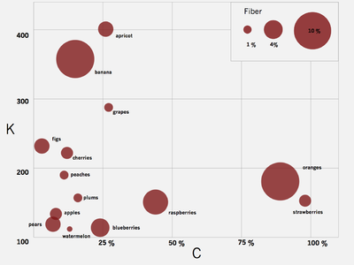 Each point refers to a 100 g serving of the fresh fruit, the daily recommended allowance of vitamin C is on the X axis and mg of Potassium (K) on the Y (offset by 100 mg which every fruit has) and the size of the disk represents amount of fiber (key in upper right). Oranges and bananas have the highest amount of fiber and are also furthest away from the bottom left indicating their superior nutrition. Watermelon which has almost no fibre and low levels of vitamin C and potassium comes in last place.