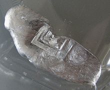 Gallium is a chemical element with symbol Ga and atomic number 31. Elemental gallium does not occur in nature, but as the gallium(III) compounds in trace amounts in bauxite and zinc ores. A soft silvery metallic poor metal, elemental gallium is a brittle solid at low temperatures. Held long enough, gallium will melt in the hand as it liquefies at temperature of 29.76 °C (85.57 °F) (slightly above room temperature). Its melting point is used as a temperature reference point. The alloy Galinstan (68.5% Ga, 21.5% In, 10% Sn) has an even lower melting point of −19 °C (−2 °F), well below the freezing point of water. From its discovery in 1875 until the semiconductor era, gallium was used primarily as an agent to make low-melting alloys.