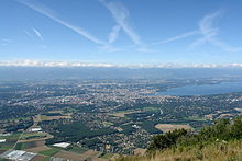 The Geneva area seen from the Salève in France. The Jura mountains can be seen on the horizon.