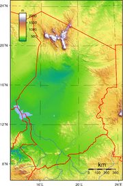 The country's topography is generally flat, with the elevation gradually rising as one moves north and east away from Lake Chad. The highest point in Chad is Emi Koussi, a mountain that rises 3,100 m (10,171 ft) in the northern Tibesti Mountains. The Ennedi Plateau and the Ouaddaï highlands in the east complete the image of a gradually sloping basin, which descends towards Lake Chad. There are also central highlands in the Guera region rising to 1,500 m (4,921 ft).