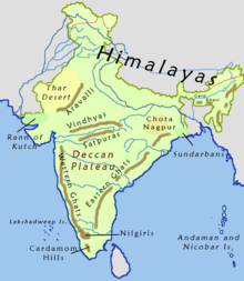The Deccan Plateau is a large triangular plateau, bounded by the Vindhyas to the north and flanked by the Eastern and Western Ghats. The Deccan covers a total area of 1.9 million km² (735,000 mile²). It is mostly flat, with elevations ranging from 300 to 600 m (1,000 to 2,000 ft). The average elevation of the plateau is 2,000 feet (600 m) above sea level. The surface slopes from 3,000 feet (900 m) in the west to 1,500 feet (450 m) in the east. It slopes gently from west to east and gives rise to several peninsular rivers such as the Godavari, the Krishna, the Kaveri and the Mahanadi which drain into the Bay of Bengal. This region is mostly semi-arid as it lies on the leeward side of both Ghats. Much of the Deccan is covered by thorn scrub forest scattered with small regions of deciduous broadleaf forest. Climate in the Deccan ranges from hot summers to mild winters.