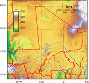 Mali's territory encompasses three natural zones: the southern cultivated Sudanese zone, central semiarid Sahelian zone, and northern arid Saharan zone. The terrain is primarily savanna in the south and flat to rolling plains or high plateau (200–500 meters in elevation) in the north. There are rugged hills in the northeast, with elevations of up to 1,000 meters. Desert or semi-desert covers about 65 percent of the country’s area. The Niger River creates a large and fertile inland delta as it arcs northeast through Mali from Guinea before turning south and eventually emptying into the Gulf of Guinea.