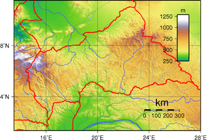 Much of the southern border is formed by tributaries of the Congo River, with the Mbomou River in the east merging with the Uele River to form the Ubangi River. In the west, the Sangha River flows through part of the country. The eastern border lies along the edge of the Nile river watershed.
