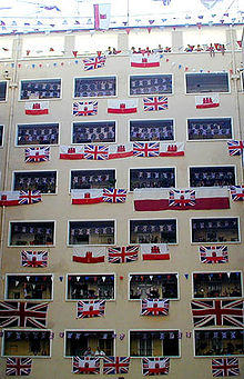 Gibraltar's first sovereignty referendum is celebrated annually on Gibraltar National Day (10 September). It is a public holiday, during which most Gibraltarians dress in their national colours of red and white and 30,000 similarly coloured balloons are released, to represent the people of Gibraltar. The 300th anniversary of Gibraltar's capture was celebrated in 2004 on Tercentenary Day (4 August), when in recognition of and with thanks for its long association with Gibraltar, the Royal Navy was given the Freedom of the City of Gibraltar and a human chain of Gibraltarians dressed in red, white and blue, linked hands to encircle the Rock. On 4 June 2012, the Gibraltar Diamond Jubilee Flotilla, inspired by the Thames Diamond Jubilee Pageant, celebrated sixty years of the Queen's reign.