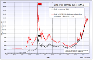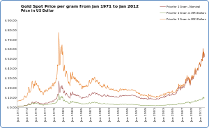 Since April 2001 the gold price has more than quintupled in value against the US dollar, hitting a new all-time high of $1,913.50 on August 23, 2011, prompting speculation that this long secular bear market has ended and a bull market has returned.