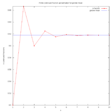 An easily programmed alternative using only integer arithmetic is to calculate two large consecutive Fibonacci numbers and divide them. The ratio of Fibonacci numbers F 25001 and F 25000, each over 5000 digits, yields over 10,000 significant digits of the golden ratio.