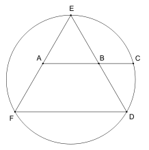 George Odom has given a remarkably simple construction for φ involving an equilateral triangle: if an equilateral triangle is inscribed in a circle and the line segment joining the midpoints of two sides is produced to intersect the circle in either of two points, then these three points are in golden proportion. This result is a straightforward consequence of the intersecting chords theorem and can be used to construct a regular pentagon, a construction that attracted the attention of the noted Canadian geometer H. S. M. Coxeter who published it in Odom's name as a diagram in the American Mathematical Monthly accompanied by the single word "Behold!"
