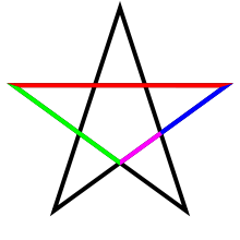 A pentagram colored to distinguish its line segments of different lengths. The four lengths are in golden ratio to one another.