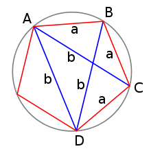 The golden ratio properties of a regular pentagon can be confirmed by applying Ptolemy's theorem to the quadrilateral formed by removing one of its vertices. If the quadrilateral's long edge and diagonals are b, and short edges are a, then Ptolemy's theorem gives b2 = a2 + ab which yields