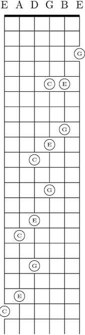 The table below shows a pitch's name found over the six strings of a guitar in standard tuning, from the nut (zero), to the twelfth fret.