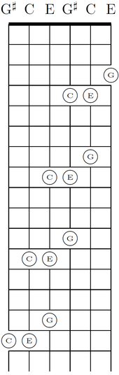 • In major-thirds tuning, the interval between open strings is always a major third. Consequently, four frets suffice to play the chromatic scale. Chord inversion is especially simple in major-thirds tuning. Chords are inverted simply by raising one or two notes by three strings. The raised notes are played with the same finger as the original notes. In contrast, in standard tuning, the shape of inversions depends on the involvement of the irregular major-third.