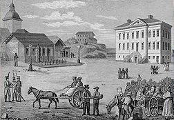 Helsinki was established as a trading town by King Gustav I of Sweden in 1550 as the town of Helsingfors, which he intended to be a rival to the Hanseatic city of Reval (today known as Tallinn). Little came of the plans as Helsinki remained a tiny town plagued by poverty, wars, and diseases. The plague of 1710 killed the greater part of the inhabitants of Helsinki. The construction of the naval fortress Sveaborg (In Finnish Viapori, today also Suomenlinna) in the 18th century helped improve Helsinki's status, but it was not until Russia defeated Sweden in the Finnish War and annexed Finland as the autonomous Grand Duchy of Finland in 1809 that the town began to develop into a substantial city. During the war, Russians besieged the Sveaborg fortress and most of the city was devastated in a 1808 fire.