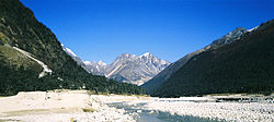 The Himalayan range at Yumesongdong in Sikkim, in the Yumthang River valley
