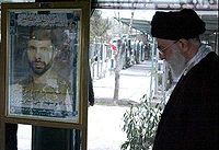 Khamenei standing beside the tomb of General Ali Sayyad Shirazi, chief of the Armed Forces of Iran during the Iran–Iraq War who was assassinated in 1999 by the MEK.