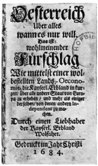 Philipp von Hörnigk (1640–1712, sometimes spelt Hornick or Horneck) was born in Frankfurt and became an Austrian civil servant writing in a time when his country was constantly threatened by Ottoman invasion. In Österreich Über Alles, Wann es Nur Will (1684, Austria Over All, If She Only Will) he laid out one of the clearest statements of mercantile policy. He listed nine principal rules of national economy.