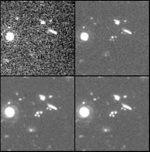 A section of the HDF about 14 arcseconds across in each of the four wavelengths used to construct the final version: 300 nm (top left), 450 nm (top right), 606 nm (bottom left) and 814 nm (bottom right)