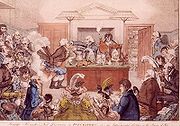 Satirical cartoon by James Gillray showing a Royal Institution lecture on pneumatics with Davy holding the bellows and Count Rumford looking on at extreme right. Dr Garnett is the lecturer holding the victim's nose.