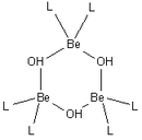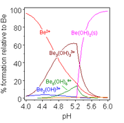 Beryllium hydroxide, Be(OH)2, is amphoteric. The hydroxide itself is insoluble in water, with a solubility product, log K*sp, of −11.7. Addition of acid gives soluble hydrolysis products, including the trimeric ion [Be3(OH)3(H2O)6]3+ which has OH groups bridging between pairs of beryllium ions making a 6-membered ring. At very low pH the aqua ion [Be(H2O)4]2+ is formed. Addition of hydroxide to Be(OH)2 gives the soluble tetrahydroxo anion [Be(OH)4]2–.