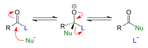 also known as saponification is an example of a nucleophilic acyl substitution with the hydroxide ion acting as a nucleophile. In this case the leaving group is an alkoxide ion, which immediately removes a proton from a water molecule to form an alcohol. In the manufacture of soap, sodium chloride is added to salt out the sodium salt of the carboxylic acid; this is an example of the application of the common ion effect.