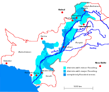 The 2011 Sindh floods began during the Pakistani monsoon season in mid-August 2011, resulting from heavy monsoon rains in Sindh, eastern Balochistan, and southern Punjab. The floods caused considerable damage; an estimated 434 civilians were killed, with 5.3 million people and 1,524,773 homes affected. Sindh is a fertile region and often called the "breadbasket" of the country; the damage and toll of the floods on the local agrarian economy was said to be extensive. At least 1.7 million acres (690,000 ha; 2,700 sq mi) of arable land were inundated. The flooding followed the previous year's floods, which devastated a large part of the country. Unprecedented torrential monsoon rains caused severe flooding in 16 districts of Sindh.