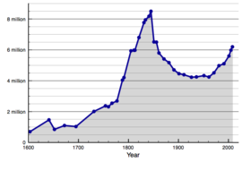 The population of Ireland since 1603 showing the consequence of the Great Famine (1845–9) (Note: figures before 1841 are contemporary estimates).