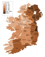 Population density map of Ireland 2002 showing the heavily weighted eastern seaboard and Ulster.