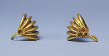 With the Mochica culture, goldwork flourished. The pieces are no longer simple metalwork, but are now masterful examples of jewellery making. Pieces are sophisticated in their design, and feature inlays of turquoise, mother of pearl, spondylus shell, and amethyst. The nose and ear ornaments, chest plates, small containers and whistles are considered masterpieces of ancient Peruvian culture.