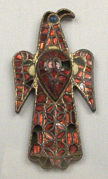 Post-Roman Europe continued to develop jewellery making skills. The Celts and Merovingians in particular are noted for their jewellery, which in terms of quality matched or exceeded that of Byzantium. Clothing fasteners, amulets, and, to a lesser extent, signet rings, are the most common artefacts known to us. A particularly striking Celtic example is the Tara Brooch. The Torc was common throughout Europe as a symbol of status and power. By the 8th century, jewelled weaponry was common for men, while other jewellery (with the exception of signet rings) seemed to become the domain of women. Grave goods found in a 6th-7th century burial near Chalon-sur-Saône are illustrative. A young girl was buried with: 2 silver fibulae, a necklace (with coins), bracelet, gold earrings, a pair of hair-pins, comb, and buckle. The Celts specialised in continuous patterns and designs, while Merovingian designs are best known for stylised animal figures. They were not the only groups known for high quality work. Note the Visigoth work shown here, and the numerous decorative objects found at the Anglo-Saxon Ship burial at Sutton Hoo Suffolk, England are a particularly well-known example. On the continent, cloisonné and garnet were perhaps the quintessential method and gemstone of the period.