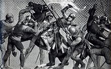 Joan of Arc (French: Jeanne d'Arc, IPA: [ʒan daʁk]; ca. 1412 – 30 May 1431), nicknamed "The Maid of Orléans" (French: La Pucelle d'Orléans), is a folk heroine of France and a Roman Catholic saint. She was born a peasant girl in what is now eastern France. Claiming divine guidance, she led the French army to several important victories during the Hundred Years' War, which paved the way for the coronation of Charles VII of France. She was captured by the Burgundians, transferred to the English in exchange for money, put on trial by the pro-English Bishop of Beauvais Pierre Cauchon for charges of "insubordination and heterodoxy", and was burned at the stake for heresy when she was 19 years old.