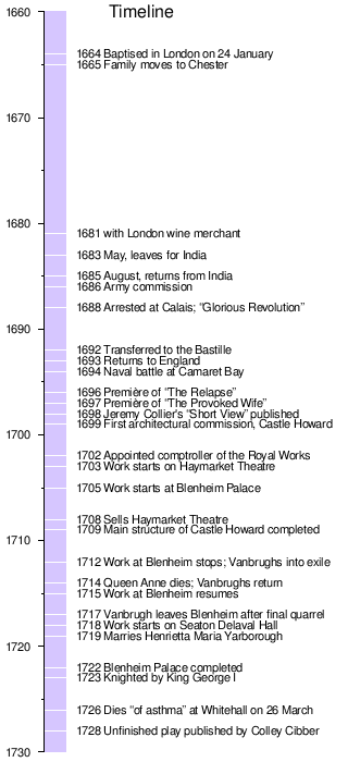 Sir John Vanbrugh (pronounced /ˈvænbrə/; 24 January 1664 (baptised) – 26 March 1726) was an English architect and dramatist, perhaps best known as the designer of Blenheim Palace and Castle Howard. He wrote two argumentative and outspoken Restoration comedies, The Relapse (1696) and The Provoked Wife (1697), which have become enduring stage favourites but originally occasioned much controversy. He was knighted in 1714.