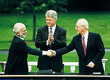 In 1991 Jordan agreed to participate in direct peace negotiations with Israel at the Madrid Conference, sponsored by the US and the Soviet Union. It negotiated an end to hostilities with Israel and signed a declaration to that effect on 25 July 1994. As a result, an Israeli-Jordanian peace treaty was concluded on 26 October 1994. King Hussein was later honored when his picture appeared on an Israeli postage stamp in recognition of the good relations he established with his neighbour. Since the signing of the peace treaty, the United States not only contributes hundreds of millions of dollars in an annual foreign aid stipend to Jordan, but also has allowed it to establish a free trade zone in which to manufacture goods that will enter the US without paying the usual import taxes as long as a percentage of the material used in them is purchased in Israel.