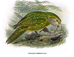 The Kakapo ( Māori: kākāpō, meaning night parrot), Strigops habroptilus (from the Greek strix, genitive strigos: owl and opsis: face; and habros: soft, and ptilon: feather), also called owl parrot, is a species of nocturnal parrot with finely blotched yellow-green plumage endemic to New Zealand. It has a distinct facial disc of sensory, vibrissa-like feathers, a large grey beak, short legs, large feet, and wings and a tail of relatively short length. A certain combination of traits makes it unique among its kind—it is the world's only flightless parrot, the heaviest parrot, nocturnal, herbivorous, it sports visible sexual dimorphism in body size, has a low basal metabolic rate, no male parental care, and is the only parrot to have a polygynous lek breeding system. It is also possibly one of the world's longest-living birds. Its anatomy typifies the tendency of bird evolution on oceanic islands with few predators and abundant food: accretion of thermodynamic efficiency at the expense of flight abilities, reduced wing muscles, a diminished keel on the sternum, a generally robust physique.