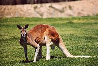 Kangaroos are the only large animals to use hopping as a means of locomotion. The comfortable hopping speed for Red Kangaroo is about 20–25 km/h (13–16 mph), but speeds of up to 70 km/h (44 mph) can be attained, over short distances, while it can sustain a speed of 40 km/h (25 mph) for nearly two kilometres. This fast and energy-efficient method of travel has evolved because of the need to regularly cover large distances in search of food and water, rather than the need to escape predators. To move at slow speeds, it uses its tail to form a tripod with its two forelimbs it then raises its hind feet forward.