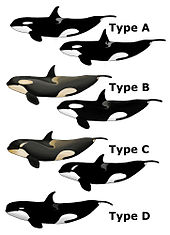• Type A looks like a "typical" killer whale, a large, black and white form with a medium-sized white eye patch, living in open water and feeding mostly on minke whales.