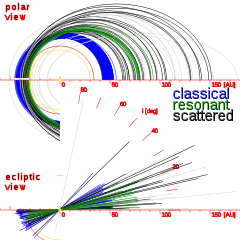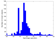 Additionally, there is a relative absence of objects with semi-major axes below 39 AU which cannot apparently be explained by the present resonances. The currently accepted hypothesis for the cause of this is that as Neptune migrated outward, unstable orbital resonances moved gradually through this region, and thus any objects within it were swept up, or gravitationally ejected from it.