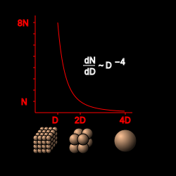The law is expressed in this differential form rather than as a cumulative cubic relationship, because only the middle part of the slope can be measured; the law must break at smaller sizes, beyond the current measure.