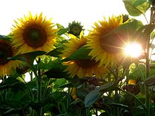 Sunflowers with the sun clearly visible behind them.