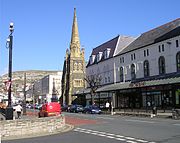 Running behind the promenade is Mostyn Street leading to Mostyn Broadway and then Mostyn Avenue. These are the main shopping streets of Llandudno and Craig-y-Don. Mostyn Street accommodates the high street shops, the major high street banks and building societies, two churches, amusement arcades and the town public library. The latter is the starting point for the Town Trail, a carefully planned walk that facilitates viewing Llandudno in a historical perspective.