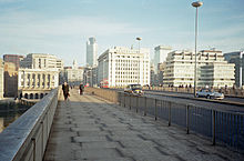 London Bridge refers to several bridges that have spanned the River Thames between the City of London and Southwark, in central London. The current crossing, which opened to traffic in 1973, is a box girder bridge constructed from concrete and steel. It replaced a 19th-century stone-arched bridge, which in turn superseded a 600-year-old medieval structure. This was preceded by a succession of timber bridges; the first was built by the Roman founders of London.
