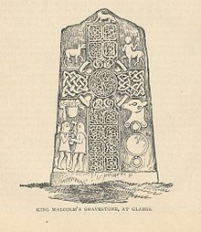 Tradition, dating from Fordun's time if not earlier, knew the Pictish stone now called "Glamis 2" as "King Malcolm's grave stone". The stone is a Class II stone, apparently formed by re-using a Bronze Age standing stone. Its dating is uncertain, with dates from the 8th century onwards having been proposed. While an earlier date is favoured, an association with accounts of Máel Coluim's has been proposed on the basis of the iconography of the carvings.