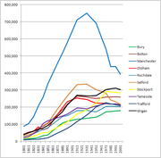 The population of Manchester shown with other boroughs in the Greater Manchester county from 1801 to 2001.