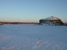 One of the most recognizable features of the Mandan was their permanent villages made up of earthen lodges. Each lodge was circular with a dome-like roof and a square hole at the apex of the dome through which smoke could escape. The exterior was covered with a matting made from reeds and twigs and then covered with hay and earth, which protected the interior from rain, heat and cold. The lodge also featured an extended portico-type structure at the entrance.