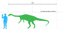 Massospondylus (pron.: / ˌ m æ s ɵ ˈ s p ɒ n d ɨ l ə s / mas-oh-SPON-di-ləs; from Greek, μάσσων (massōn, "longer") and σπόνδυλος (spondylos, "vertebra")) is a genus of prosauropod dinosaur from the early Jurassic Period ( Hettangian to Pliensbachian ages, ca. 200–183  million years ago). It was described by Sir Richard Owen in 1854 from remains found in South Africa, and is thus one of the first dinosaurs to have been named. Fossils have since been found at other locations in South Africa, Lesotho, and Zimbabwe. Material from Arizona's Kayenta Formation, India, and Argentina has been assigned to this genus at various times, but the Arizonan and Argentinian material are now assigned to other genera.