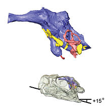 Endocast of brain cavity (above) and transparent skulls with endocasts in place (below) showing head posture, based on µCT scans of specimen BP 1/4779