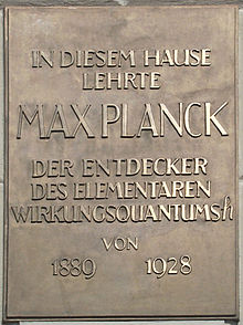 Plaque at the Humboldt University of Berlin: "Max Planck, discoverer of the elementary quantum of action h, taught in this building from 1889 to 1928."