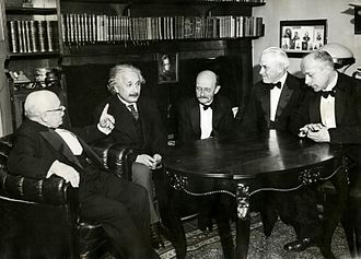 From left to right: W. Nernst, A. Einstein, M. Planck, R.A. Millikan and von Laue at a dinner given by von Laue in Berlin on 11 November 1931