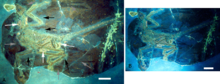 | Fossil specimen, with white arrows pointing at preserved feathers | |