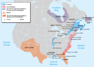 Map of North America's political divide during the 18th century (after the Treaty of Utrecht (1713) and before the Treaty of Paris (1763)) showing forts, towns and areas occupied by European settlements – Britain (pink & purple), France (blue), and Spanish claims (orange; California, Pacific Northwest, and Great Basin not indicated)